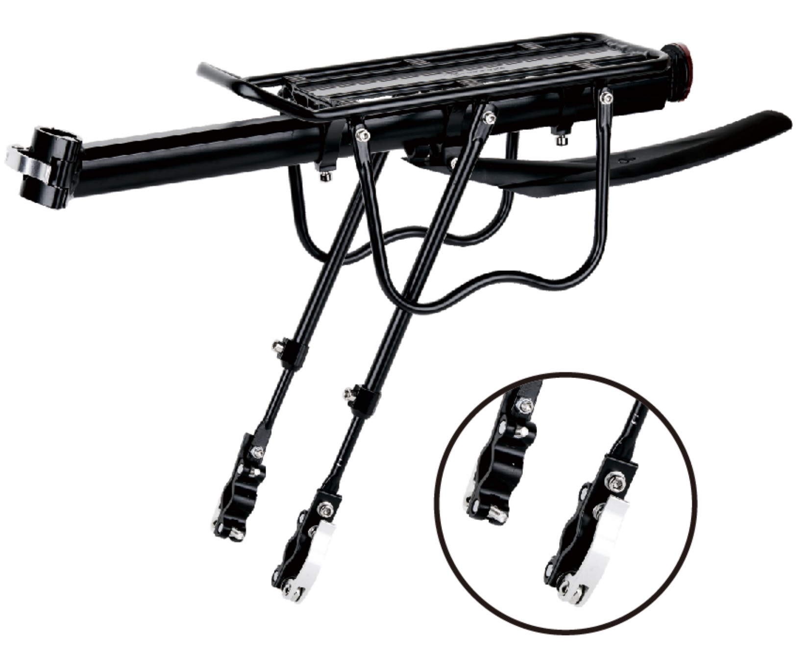Багажник 24"-28" BLF-H27-5 универсальный, с быстросъёмным креплением за подседельный палец, с регулировкой высоты стоек с универсальными креплениями, для велосипедов различных размеров, алюминиевый чёрный, с щитком колеса.