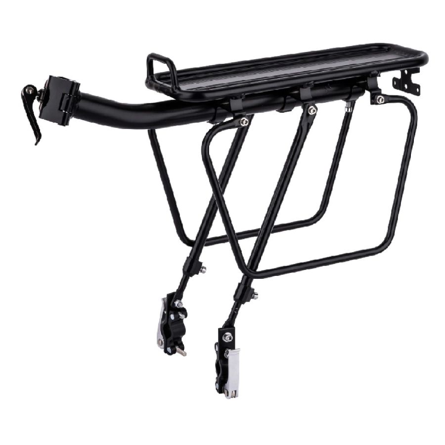 Багажник универсальный, с быстросъёмным креплением за подседельный палец, с регулировкой высоты стоек с универсальными креплениями, для велосипедов различных размеров, алюминиевый чёрный.