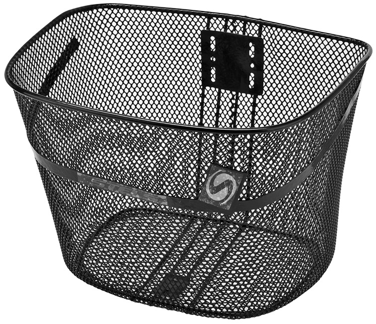 Велокорзина передняя стальная чёрная с логотипом STELS, размер 35х24х28см, стойки для 28" с креплением за ось втулок.