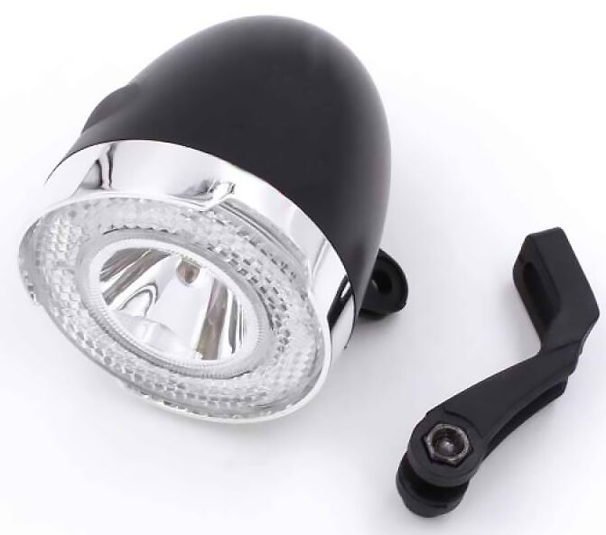 Водонепроницаемый IP44, 1 функция. Световой элемент: 1 белый LED, 0,5W, 15 LUX (60lum). Крепление: к вилке велосипеда из пластика. Питание: AAА (1.5V) - 4 шт. в комплекте.