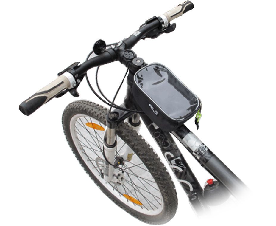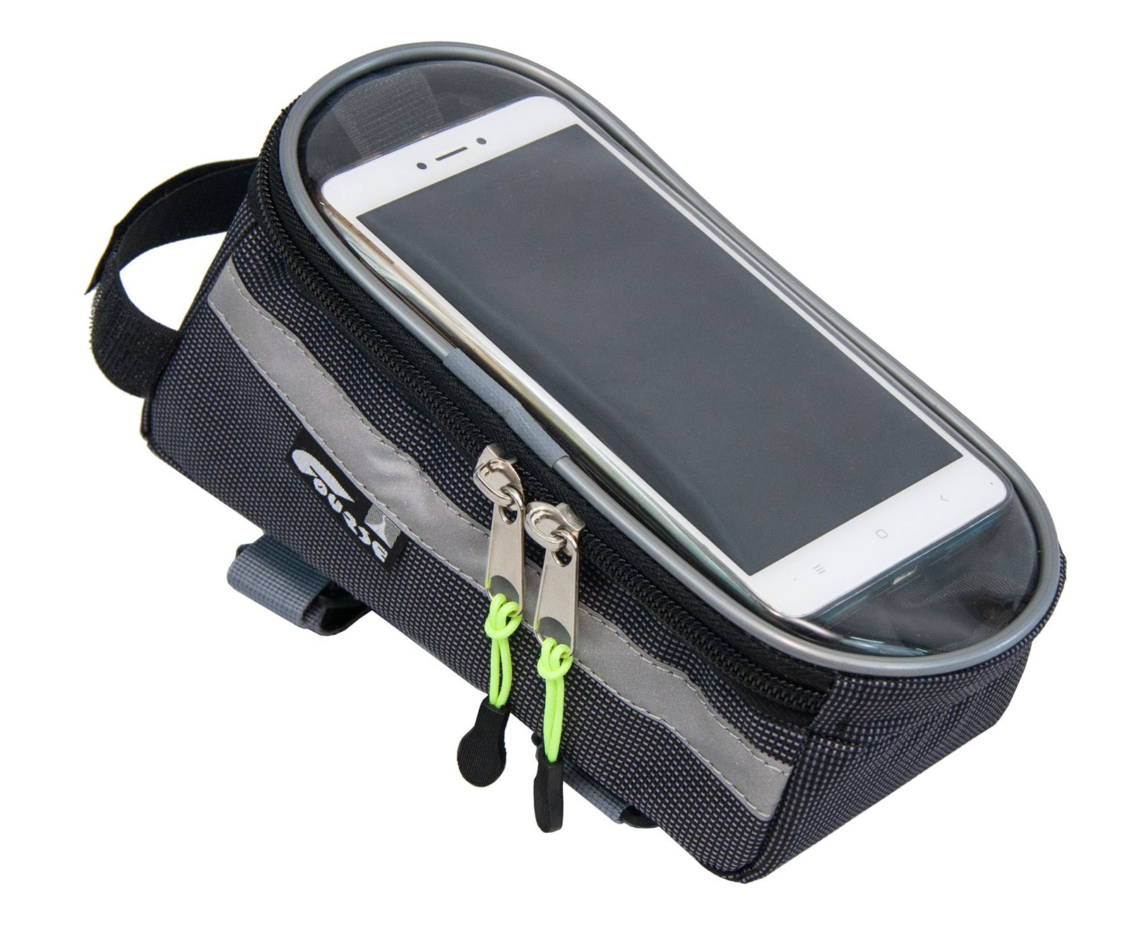 В кармане верхней части велосипедной сумки удобно помещается смартфон среднего размера (15 см на 8 см).
