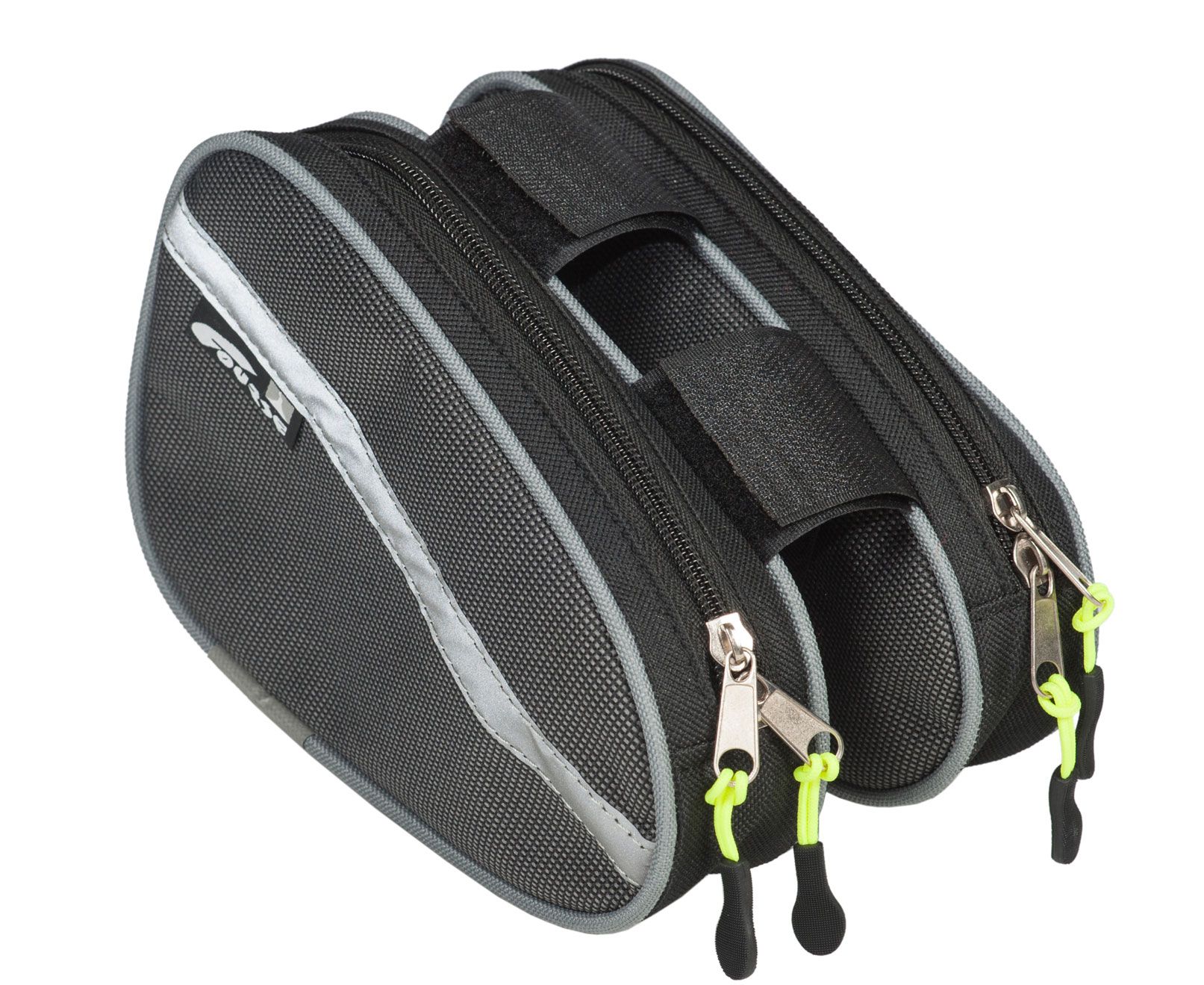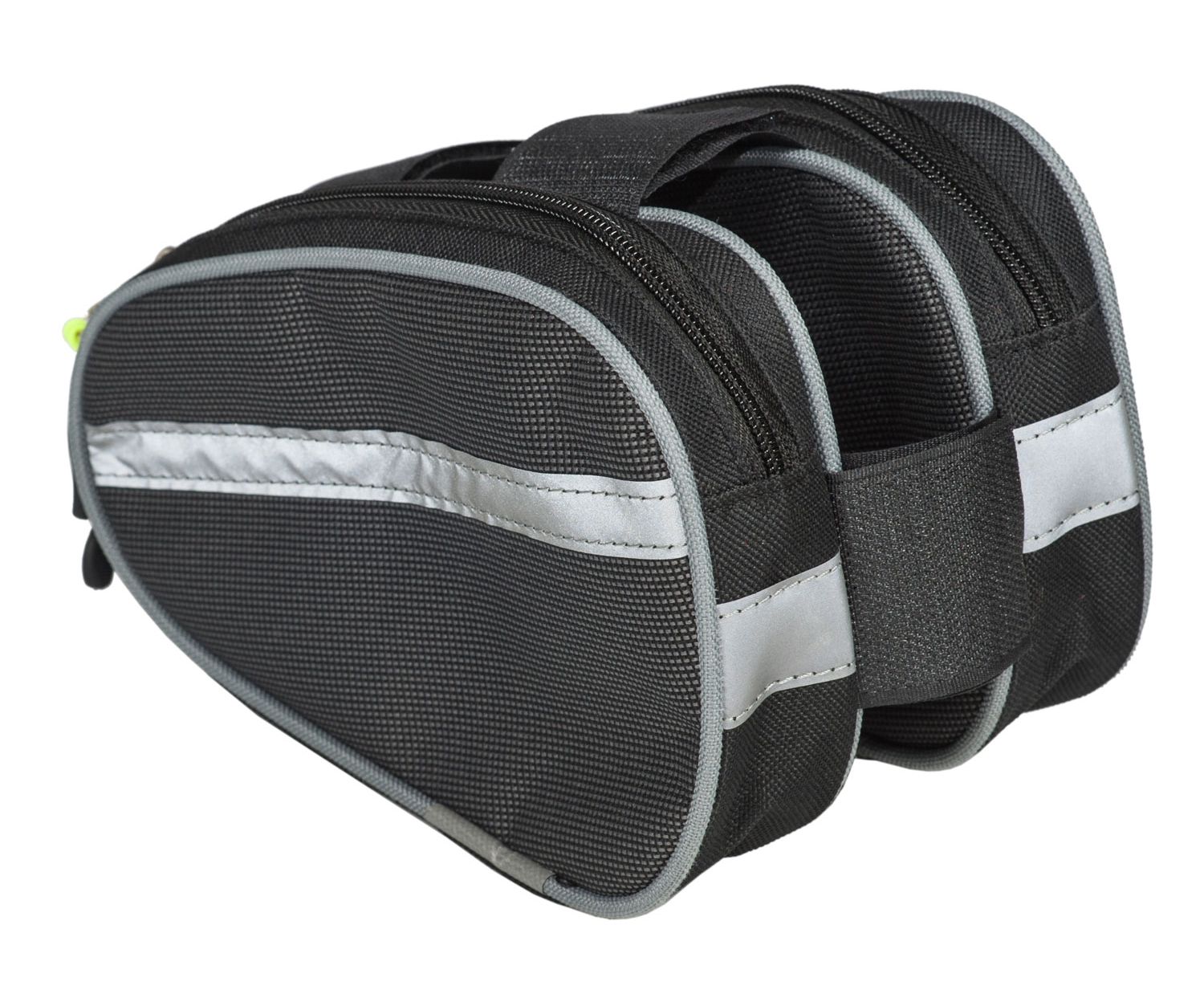 Удобная велосипедная сумка, состоящая из двух независимых отделений. Комплектуется светоотражающей полосой — повышает безопасность велосипедиста ночью.