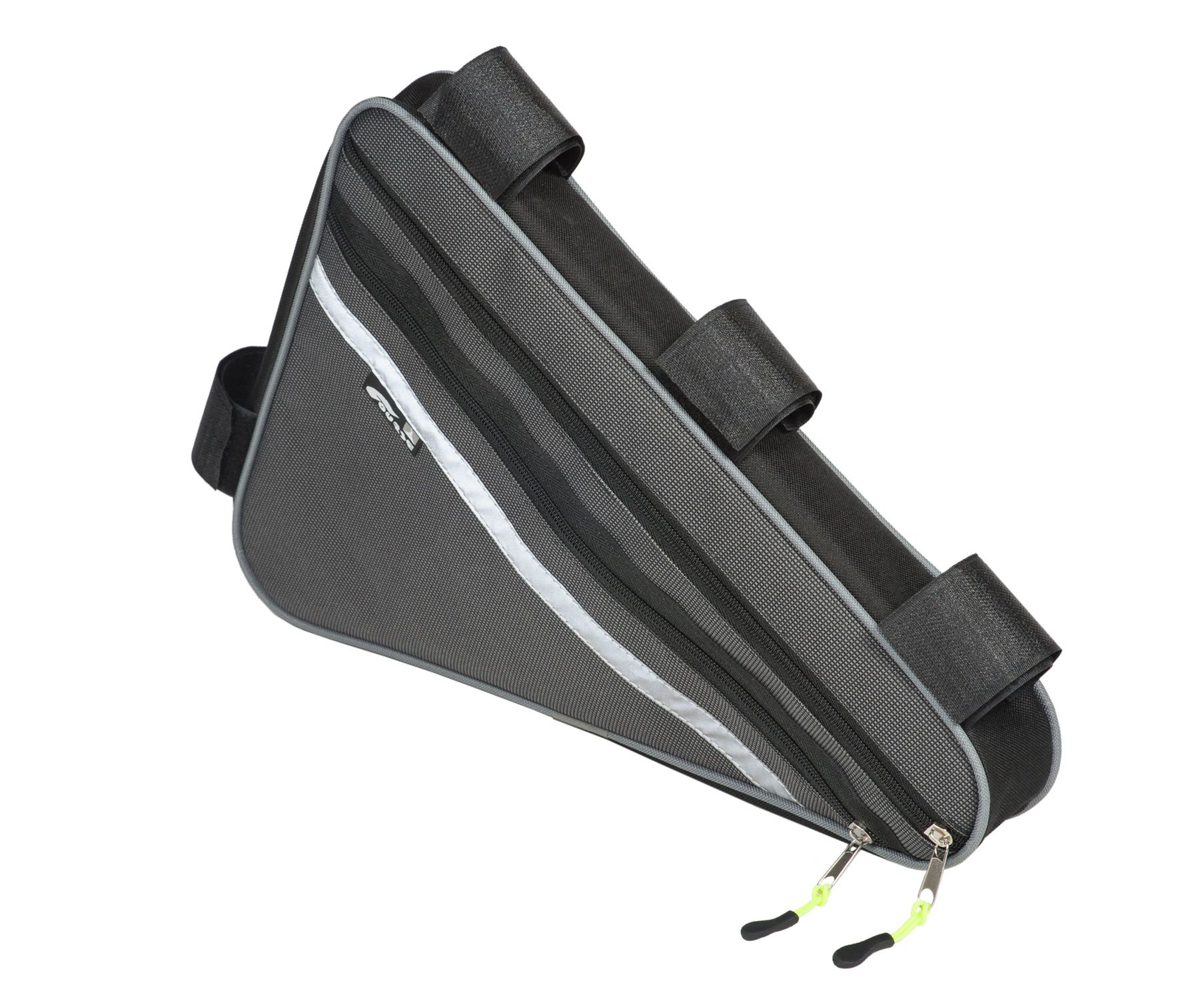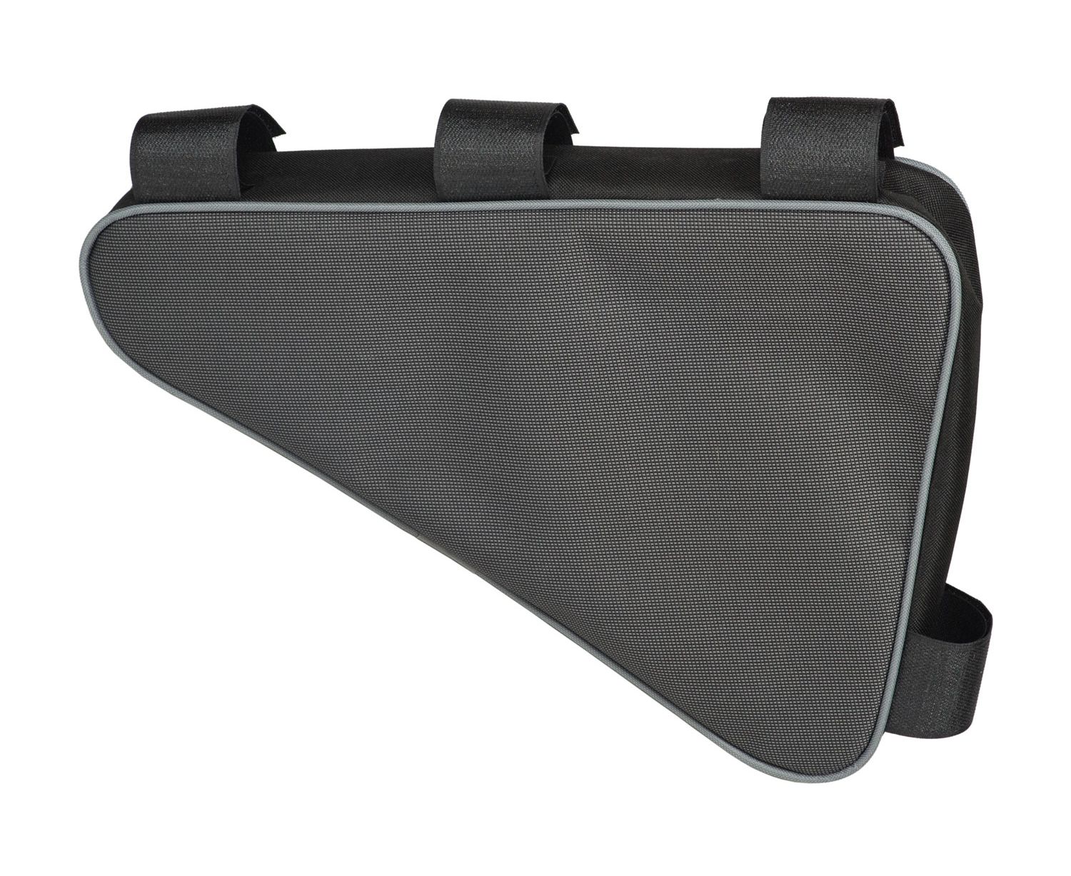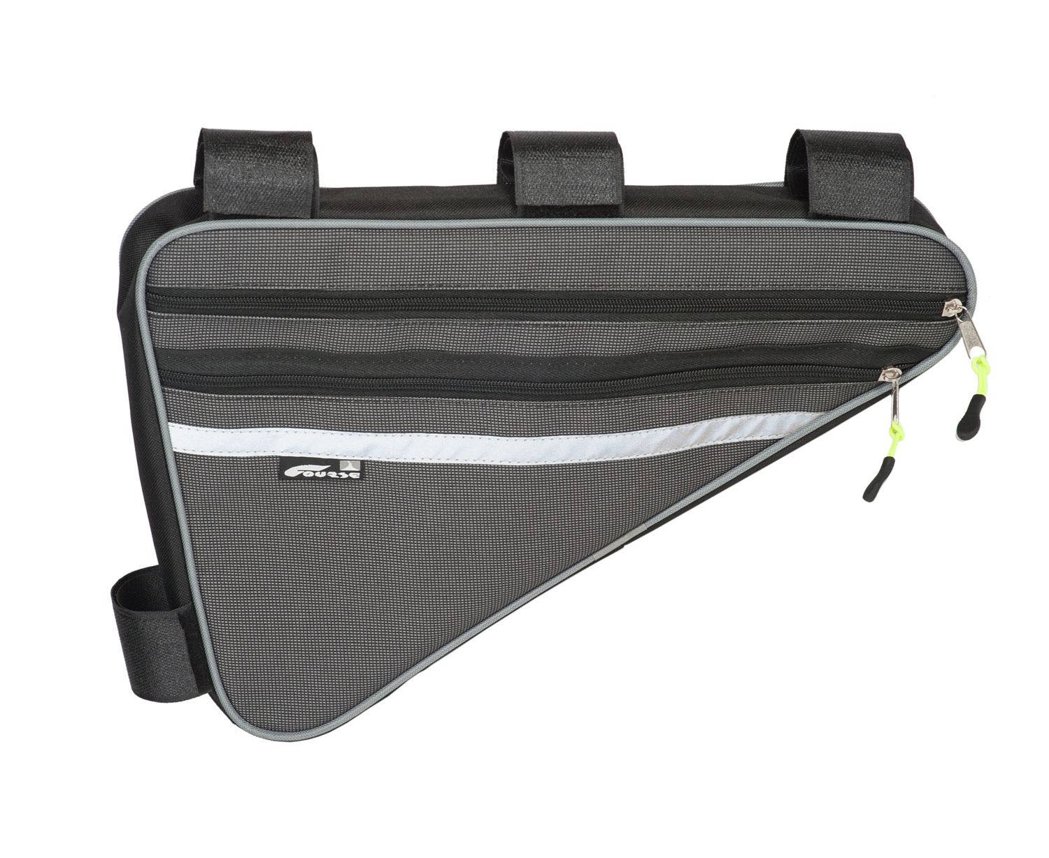 Сумка крепится в заднюю часть треугольника рамы, ближе к седлу велосипеда. В эту велосумку можно положить бутылку воды объемом 1,5 литра или полноразмерный велосипедный насос, плащ, перчатки и т. п. В дополнительный карман удобно складывать мелкие вещи, например, велосипедный трос с замком.