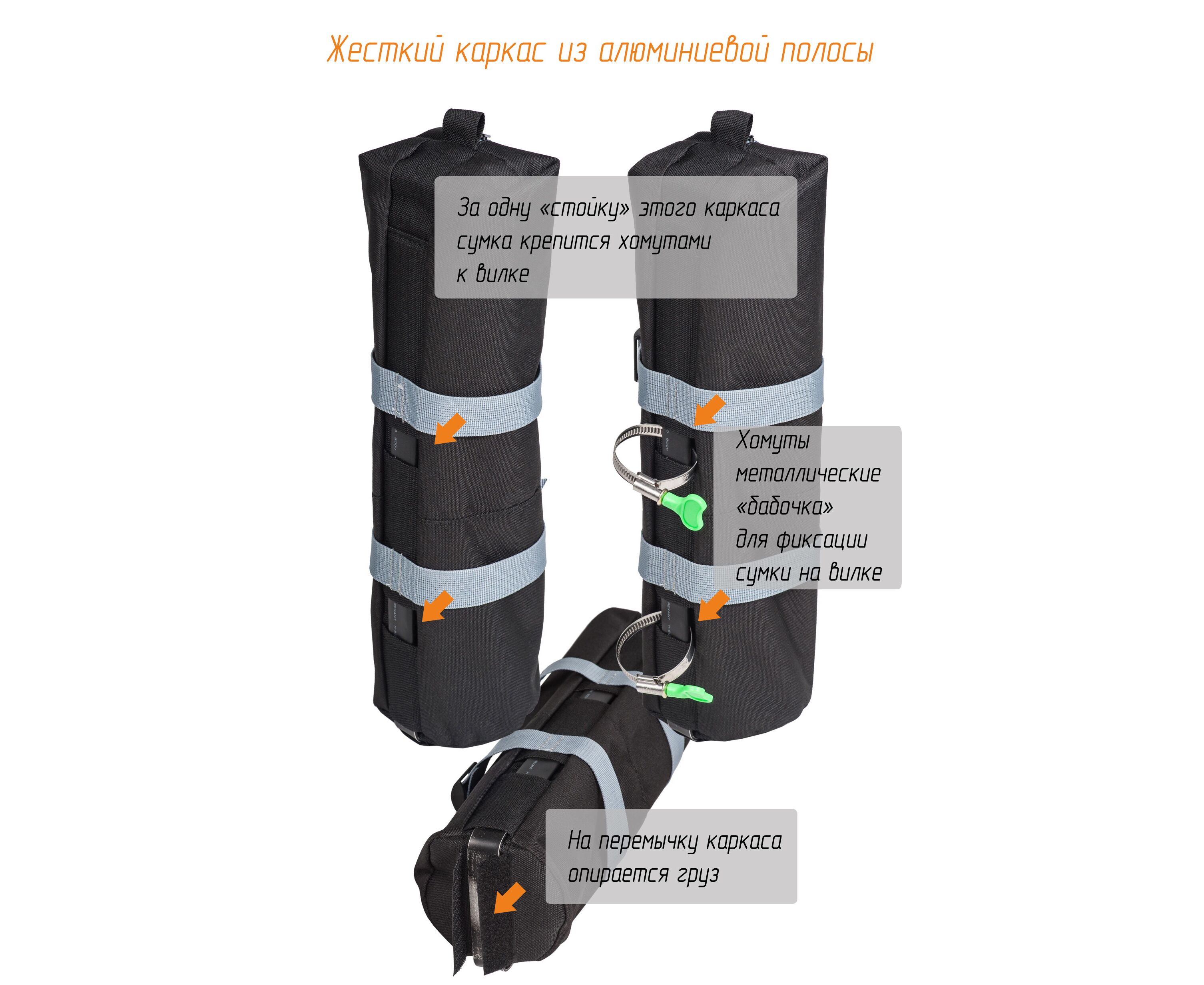 - за одну «стойку» этого каркаса сумка крепится хомутами к вилке,