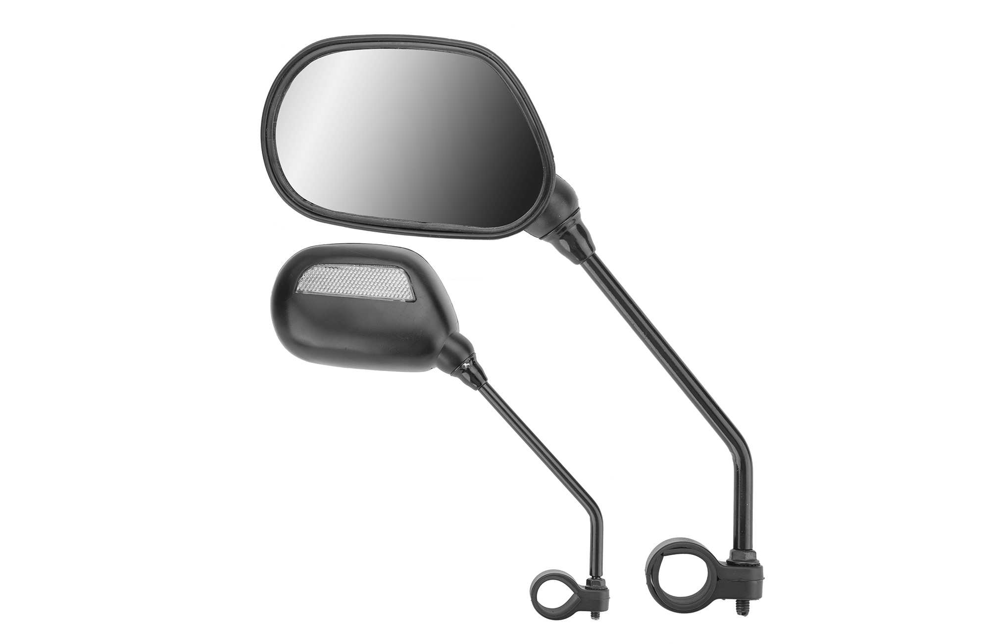 Комплект зеркал заднего вида для велосипеда - правое и левое. Изготовлены из стали, окрашены в черный цвет. Оснащены световозвращателями.