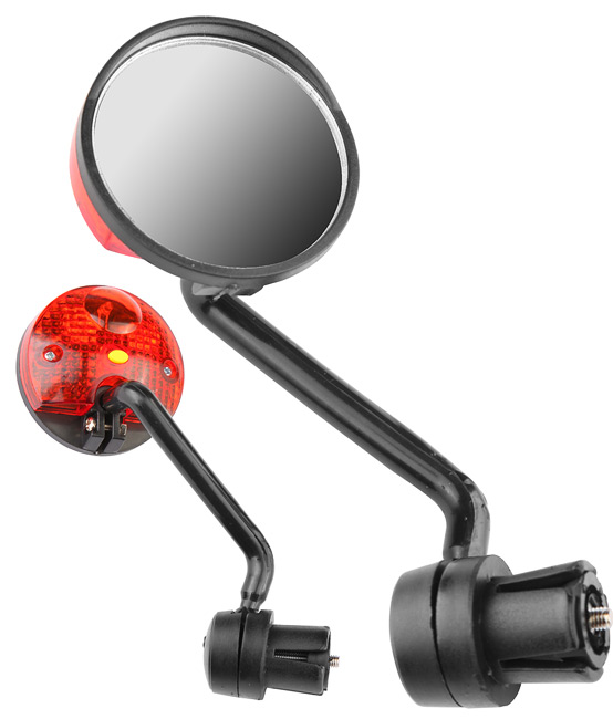 Пластиковое зеркало заднего вида JY-5 для велосипеда. Оснащено световозвращателем и габаритным огнем (1 светодиод), который работает без батареек.