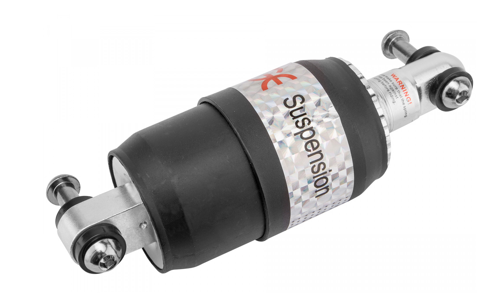 Задний амортизатор рамы TF-D пружинный, межосевое расстояние 165 мм, сила сжатия 850 фунтов (386 кг), посадочная ширина: 24/21,75 мм, болты: 32/32 мм, резиновый защитный кожух для защиты оси и пружины, регулировка сжатия пружины