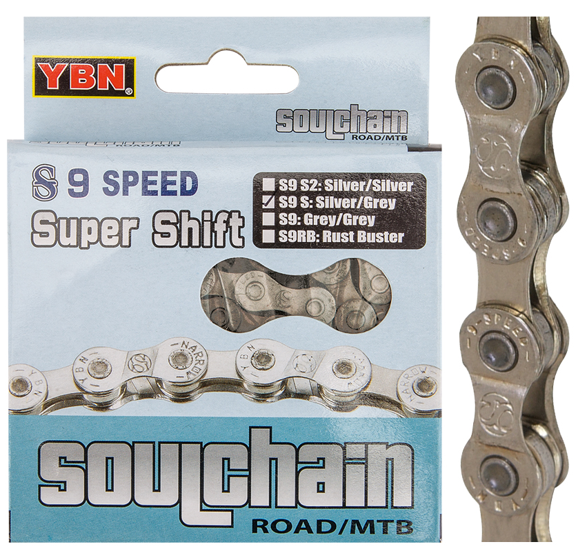 Цепь S9S 1/2"x11/128" для 9 скоростей, с замком, совместимо с системами Shimano, Campagnolo, SRAM, закаленные хромированные пины и ролики, усиленная клепка пинов в потай, 116 звеньев, в индивидуальной упаковке. Цвет: серебристо-серый.